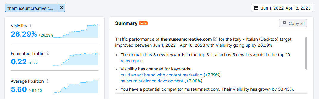 With strategic SEO best practices, I increased my website visibility by 26.29% and gained a 5.60 avg position in the SERP in less than a year.