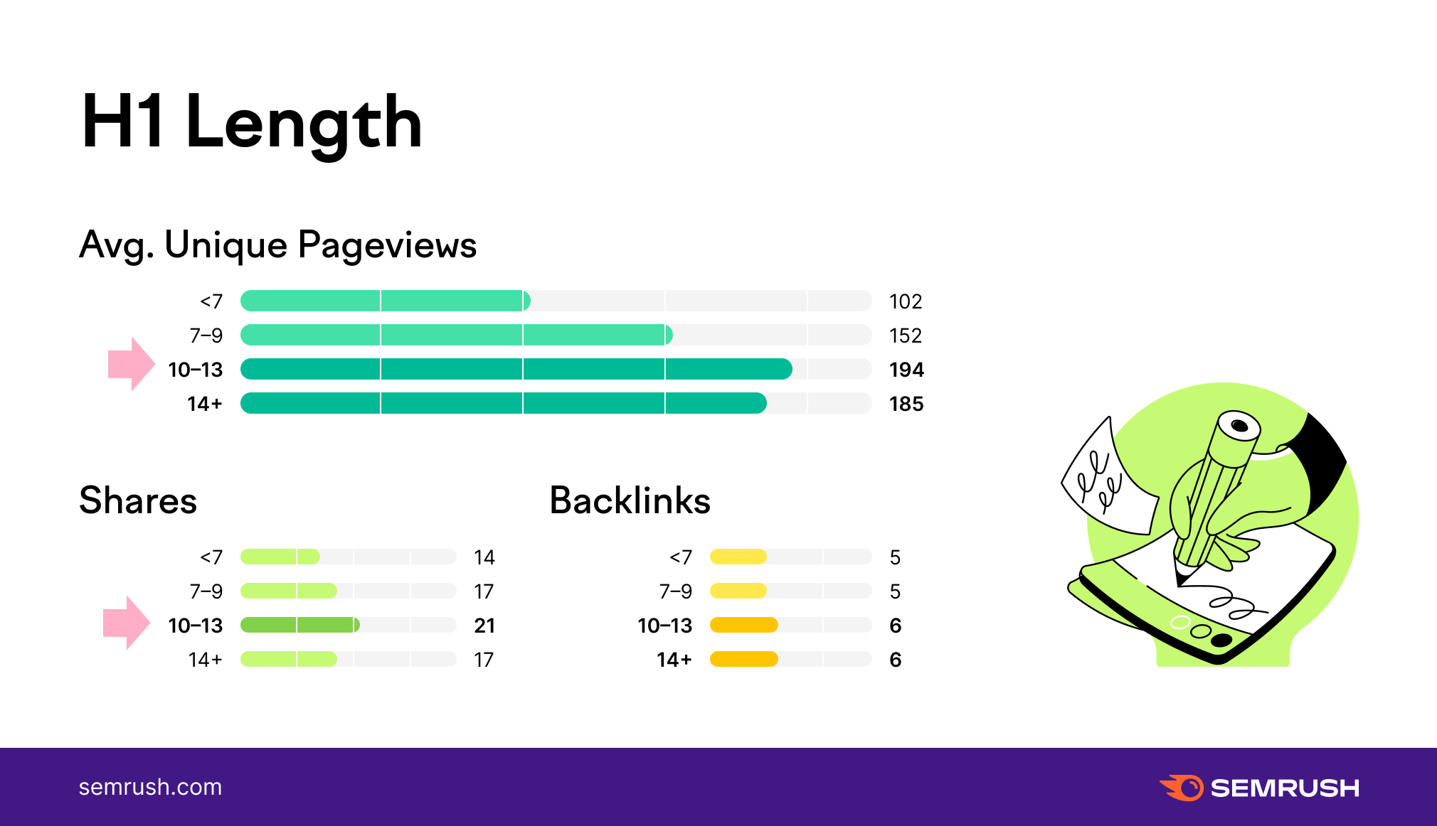 Plus, headlines that are 10-13 words in length drive twice as much traffic and x1.5 more shares than shorter ones. (Semrush)
