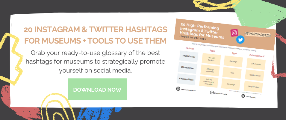 Do you need an updated list of popular hashtags for museums? Download the 20 high-performing museum hashtags list (with tools) to include in your Instagram and Twitter posts!